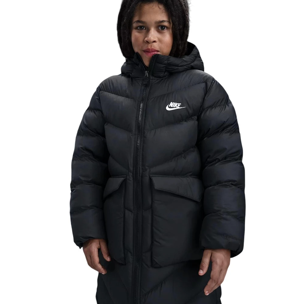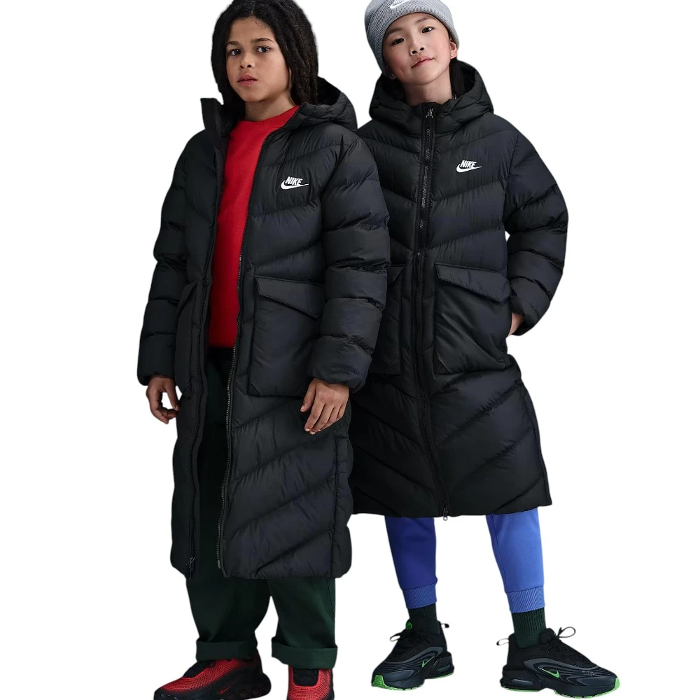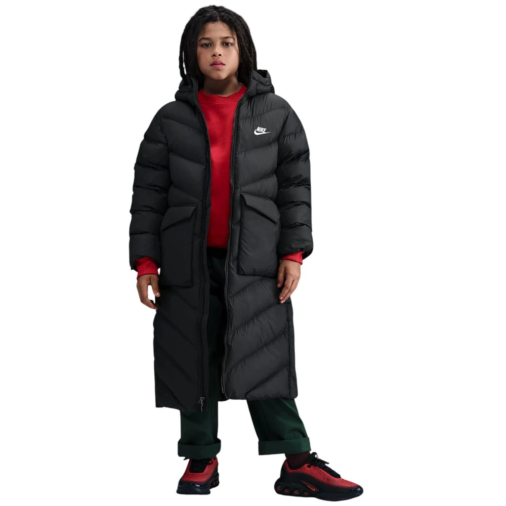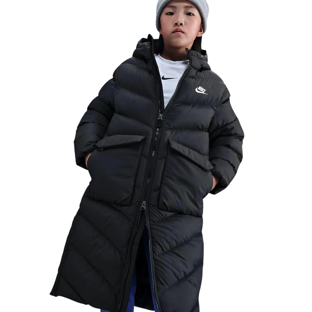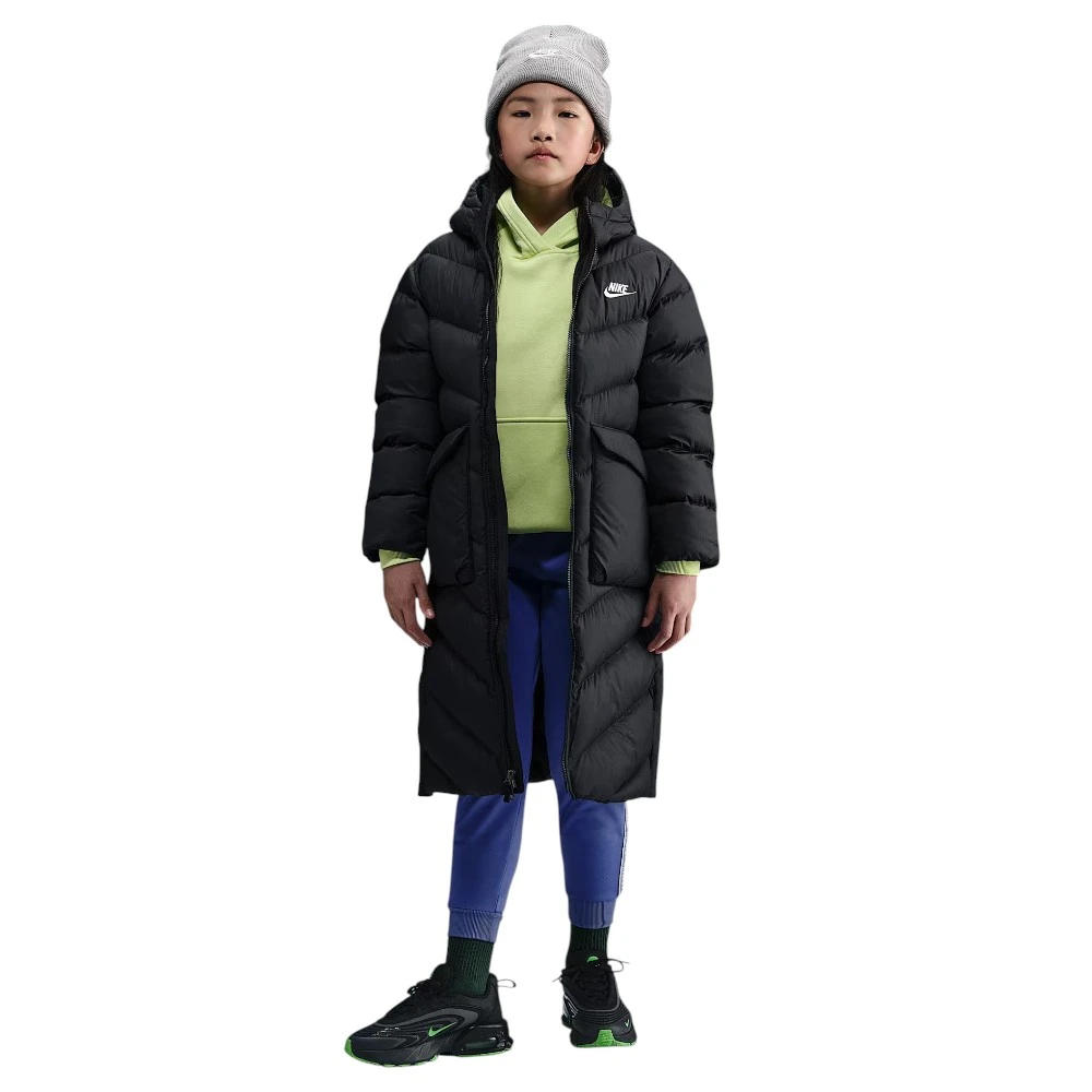 Эта куртка длиной до колена сочетает лёгкий синтетический утеплитель и технологию Therma-FIT, которая сохраняет естественное тепло тела, не утяжеляя образ. Свободный крой и боковые кнопки позволяют легко комбинировать разные слои одежды и двигаться свободно.