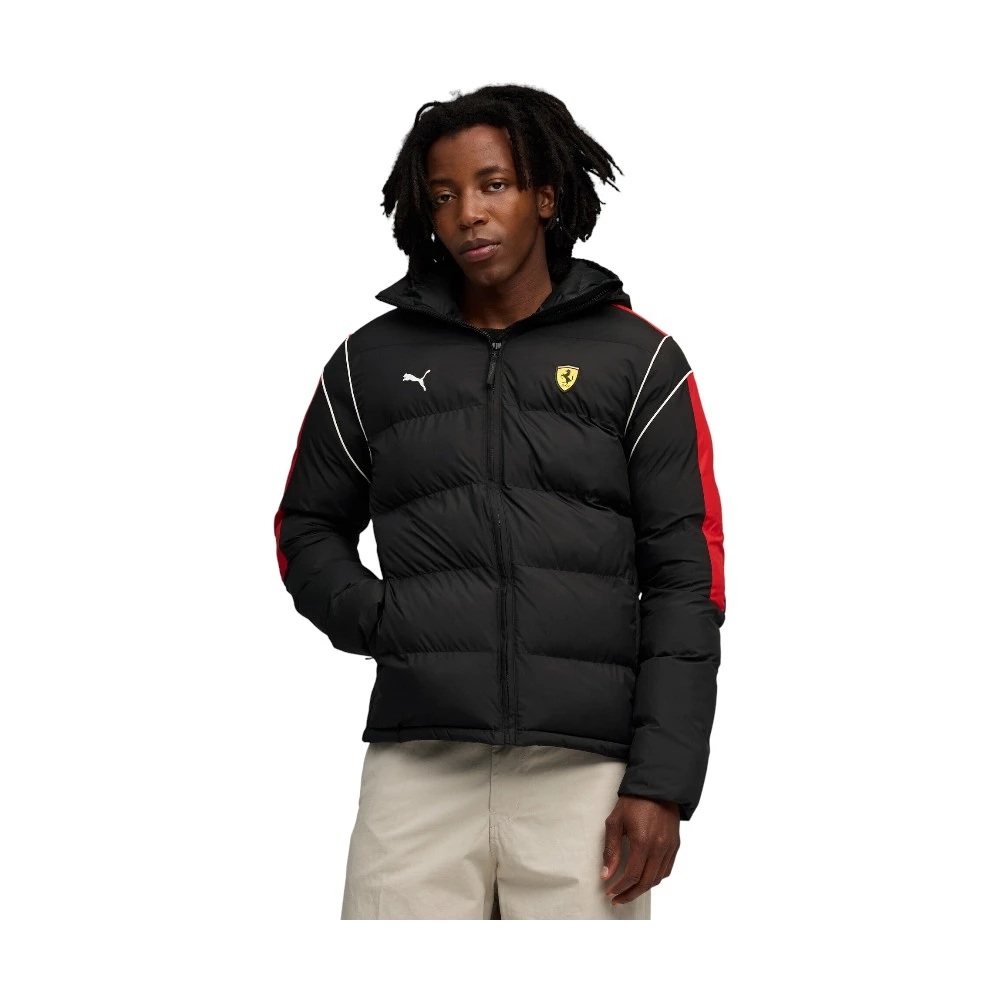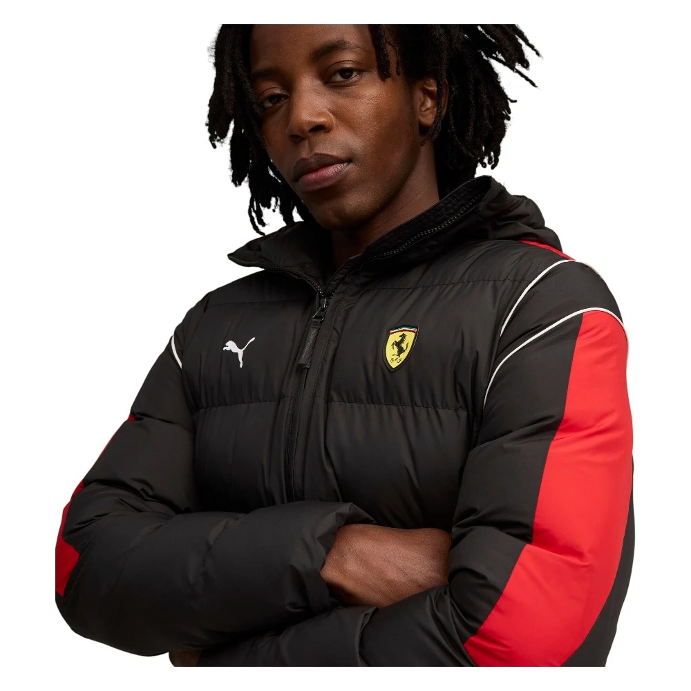 Логотипы PUMA Cat и Scuderia Ferrari, контрастные полосы и аккуратные детали подчёркивают характер культового бренда, добавляя образу динамику и стиль.