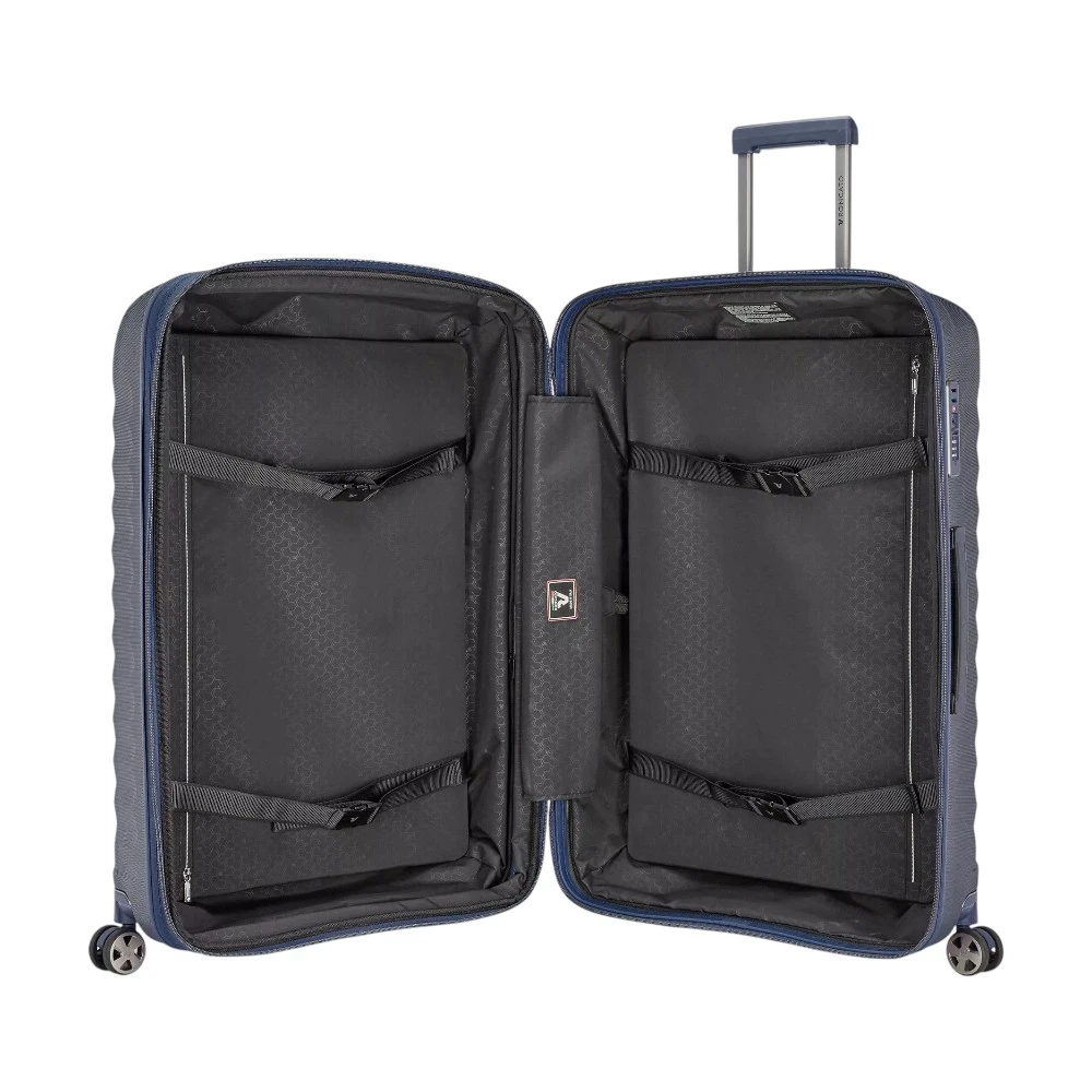 Корпус из поликарбоната с бриллиантовым покрытием защищает вещи от ударов и царапин, а расширяемая система увеличивает объём до 135 л. Продуманная внутренняя организация с лямками и съёмными подкладками позволяет удобно упаковать одежду и аксессуары.
