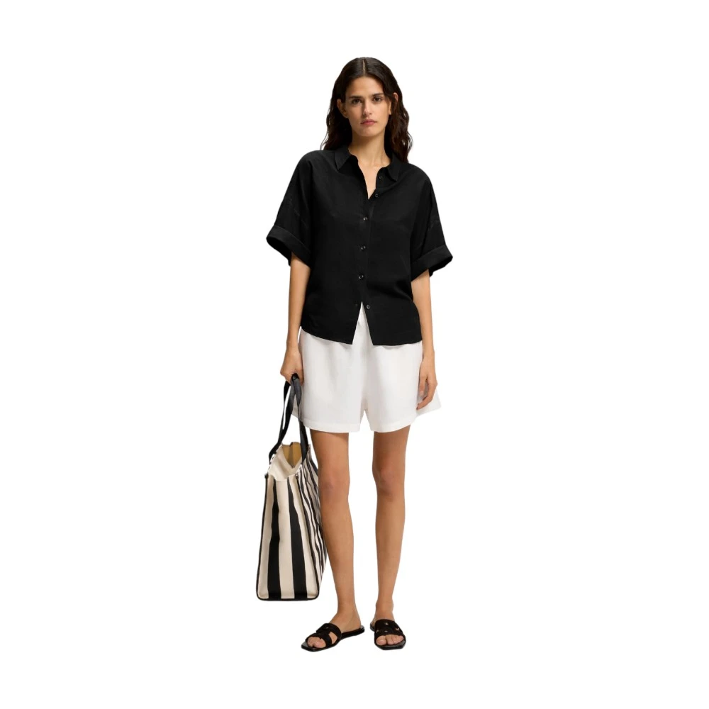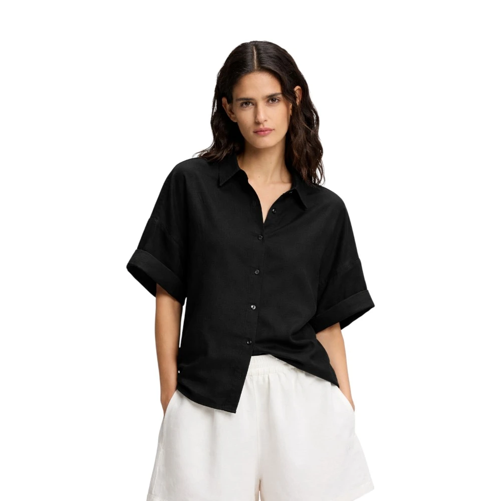 Свободный крой и короткий рукав с аккуратным подворотом формируют расслабленный, но собранный силуэт. Классический воротник и аккуратная застёжка на пуговицах подчёркивают сдержанную элегантность модели. Чёрный цвет делает рубашку универсальной основой гардероба и позволяет легко сочетать её с брюками, юбками и шортами.