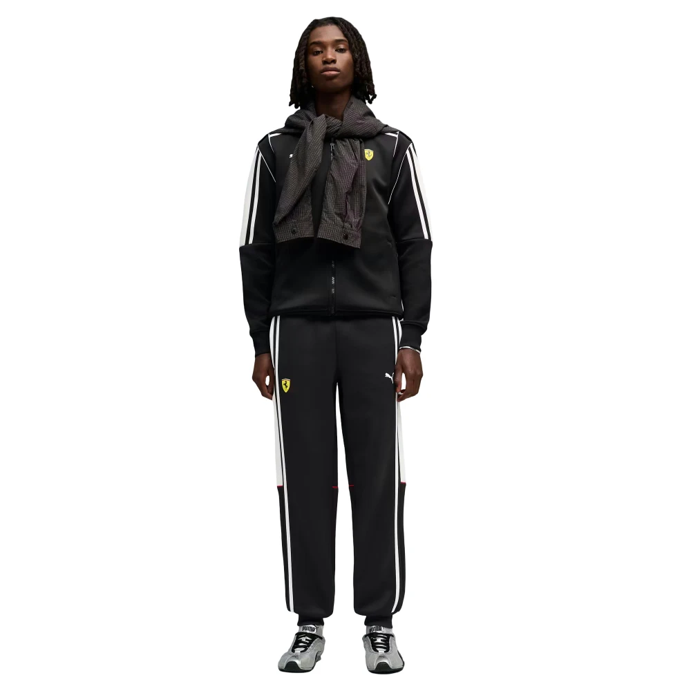 Дизайн модели дополнен фирменными элементами Ferrari и PUMA, которые придают брюкам премиальный и динамичный характер. Чёрный цвет делает модель универсальной и легко сочетаемой с различными элементами гардероба — от спортивных комплектов до casual-образов.